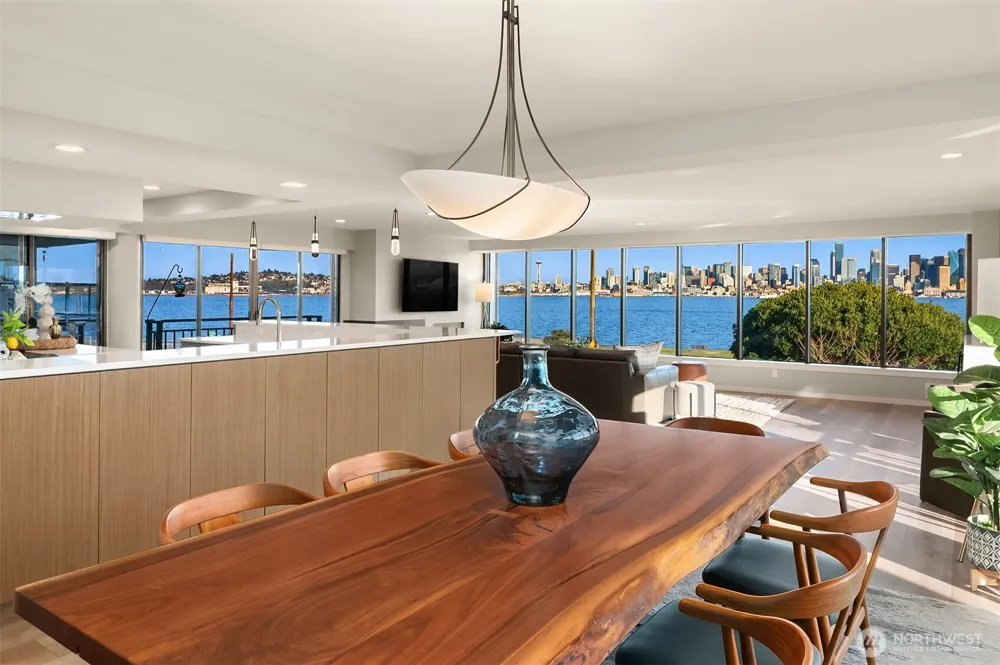 This extraordinary full-floor 3-bedroom residence on Alki commands unrivaled 270° panoramic views, your front-row seat to downtown Seattle, the Space Needle, the Cascade Mountains and the iconic Elliott Bay with its ever-changing maritime activity. Floor-to-ceiling windows wrap this luxury home on three side, offering unobstructed views from every window and filling it with natural light from sunrise onward. Masterfully renovated with over $490K in luxury upgrades, the open floor plan features a stunning chef’s kitchen with massive wrap-around counters, oversized pantry, and an expansive eating bar—ideal for culinary enthusiasts and effortless entertaining. Wide-plank flooring, custom built-ins, inviting gas fireplace, mini-split, and high-end finishes create a refined, modern living experience. The spacious primary bedroom includes a beautifully updated en-suite, with two additional bedrooms offering flexible use for guests, office, or creative pursuits. Direct keyed elevator opens into a private vestibule with no shared walls and no neighbors on either side for exceptional privacy and tranquility. Enjoy two view balconies, 2 assigned parking spaces, 2 storage units, and secure building access in this 7-unit boutique steel-and-concrete setting. All of this just steps to the Alki promenade, the water taxi to downtown, Salty’s, parks, and the vibrant beachside dining and café scene that defines Alki living. The good life starts here!