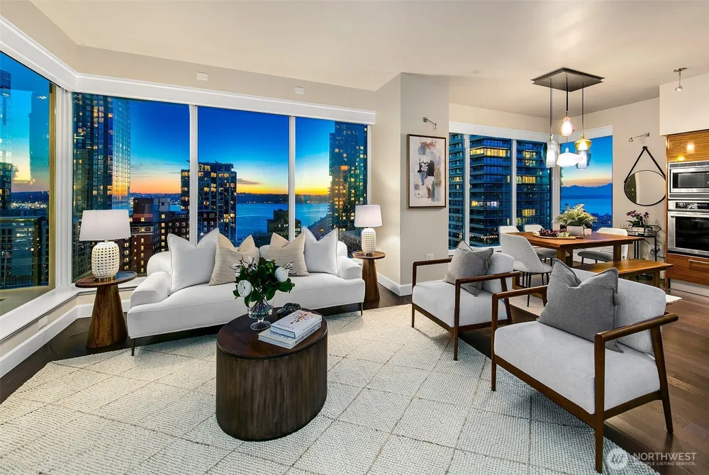 South Western water, city and Olympic mountain views. Experience Escala luxury living in this expansive oversized 2bedroom show stopper condo! This prestigious residence features amazing 220sqft outdoor space, garden & grill. Incredible value for the luxury buyer, featuring stunning designer upgrades- entry offers built in beverage cooler with custom counter and cabinets, milestone finished column, designer vestibule, modern light fixtures. Abundant light floods your home from soaring 10-foot floor-to-ceiling windows. Breathtaking night views- home embodies modern elegance. Step into a spacious, open-concept layout designed for both comfort & sophistication-perfect for entertaining or relaxing in style. Premium finishes, top-tier appliances &exclusive building amenities set a new standard for urbanliving. 2 premier parking + 1storage. World Class amenities, 2 pools, fitness center, spa, theater room, wine cave, 2 zoom meeting rooms, full caterer kitchen, owners event space hosts 120 guests! 24/7 concierge.